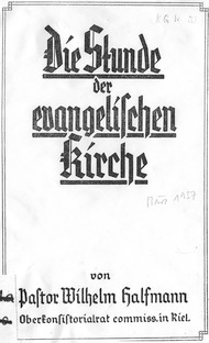 Heft 12: Die Stunde der evangelischen Kirche. Von Pastor Wilhelm Halfmann, Oberkonsistorialrat commiss. in Kiel, Amt für Volksmission, Breklum 1937 (wurde eingezogen und verboten).